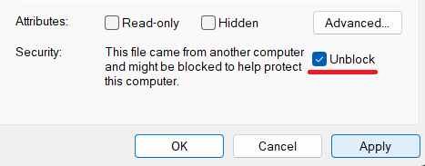 If the Unblock option is shown, click the checkbox and click Apply, then OK: